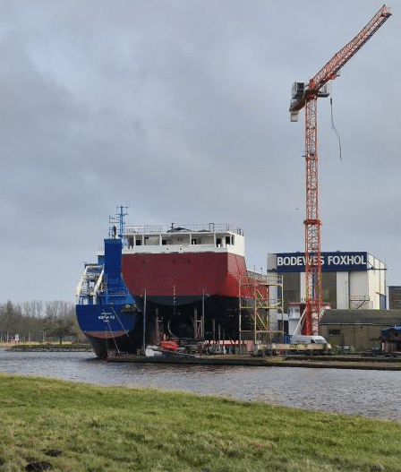 The aftship of NB 758, a diesel-electric RB 5800 Eco Trader, is on the quay of the Bodewes Foxhol location. 📸 Oma’s op de boot